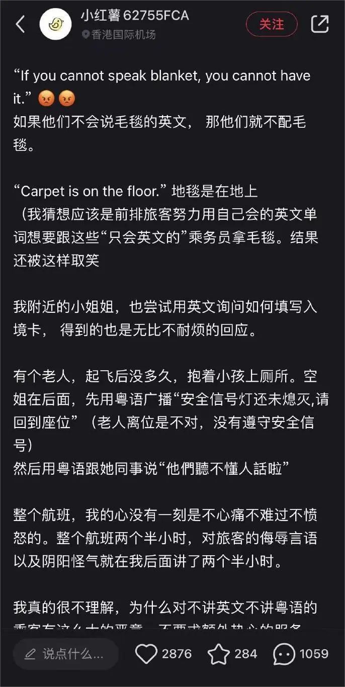 這些羞辱和歧視都是用英語或粵語表述出來的。很顯然,國泰航空的這幫空乘要麼是欺負航班上的旅客不會説英語或粵語,要麼就是它們哪怕知道你聽得懂也不在乎,畢竟這趟是從成都飛往中華人民共和國香港的航班,它們很清楚飛機上坐的大多都是什麼人,無論前者還是後者,國泰空乘所説的這些帶有強烈羞辱意味的歧視性言論,擺明了就是赤裸裸衝着大陸旅客來的。