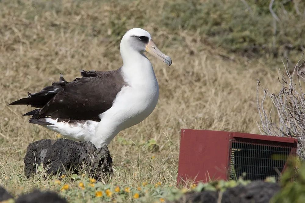 一隻黑背信天翁成鳥走過誘捕籠 ©大狼
