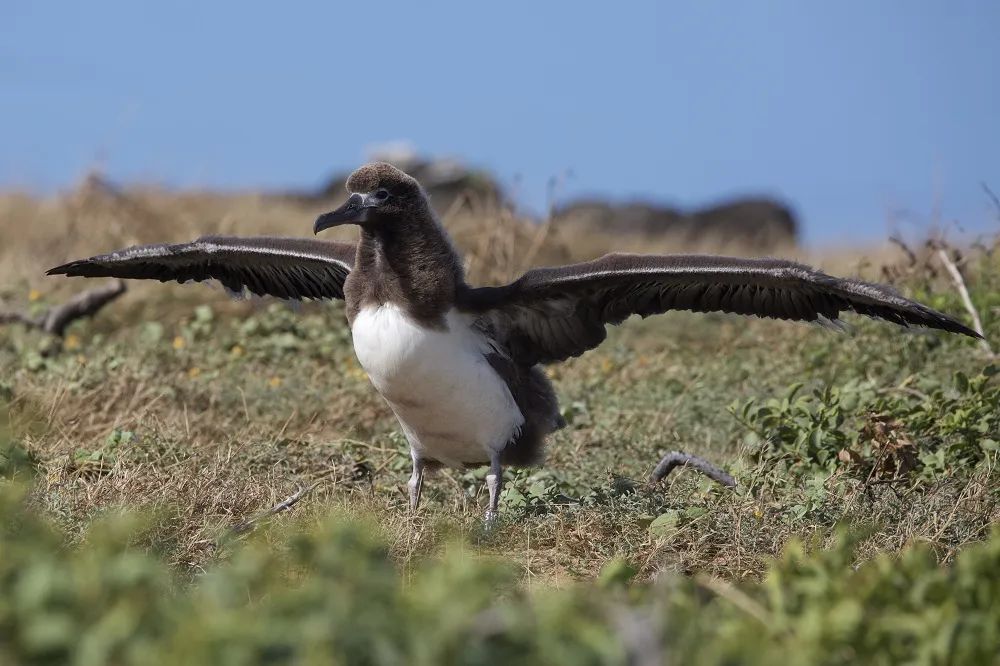 與外面肆意蔓延的野草不同,保護區內的沙地雖並未徹底清除入侵植物,但更多是由草海桐這一本土物種佔據。它們對於信天翁的繁殖至關重要,能為信天翁的蛋與幼鳥提供珍貴的遮蔽和陰涼,讓它們免於熱帶那難忍的直曬與泠冽的海風。