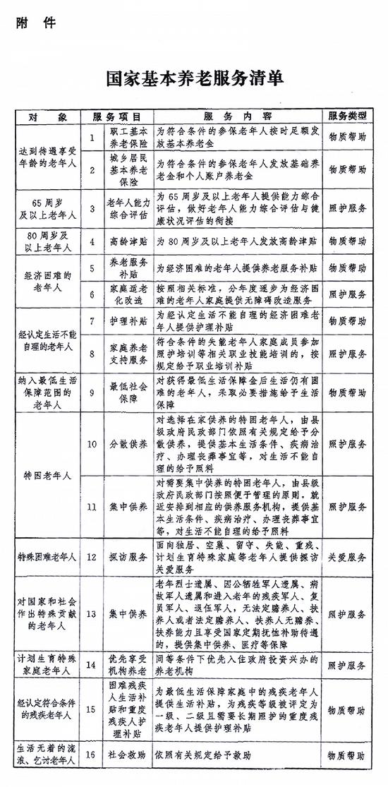 界面新聞注意到,《意見》附件公佈的《國家基本養老服務清單》,針對12類對象,給出了16項養老公共服務的基本任務和事項。比如,對於經認定生活不能自理的老年人,提供的服務項目包括護理補貼和家庭養老支持服務,對符合條件的失能老年人家庭成員參加照護培訓等相關職業技能培訓的,按照規定給予職業培訓補貼。針對計劃生育特殊家庭老年人,即通常所説的失獨家庭老年人,服務內容為同等條件下優先入住政府投資興辦的養老機構。