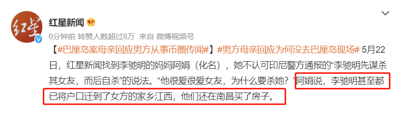 **在巴厘島警方判定李馳明為兇手後,李馳明的媽媽首次公開發聲,予以堅決否認,不可接受。**根據李馳明媽媽所言,在李馳明遇害前,李馳明跟他媽媽通了電話,在電話裏説了自己遇到生命威脅。不僅李馳明遇到了生命威脅,李馳明的媽媽也接到過恐怖電話。