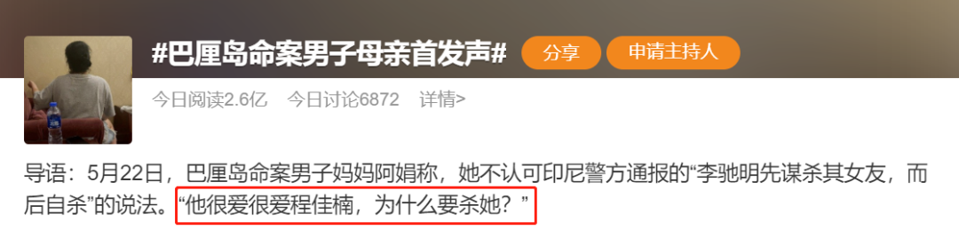 按照印尼警方的説法,男性受害人李馳明先殺了他的女友程嘉楠,後自殺。這就意味着,被害人與兇手一起死了,整個案子就死無對證了,印尼警方想怎麼説就怎麼説,破案全憑一張嘴。