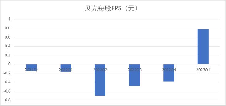ACN模式帶來的產業價值提升,與一體兩翼帶來的企業穿越週期能力,共同作用下,使得貝殼的成長確定性獲得雙重驗證:今年一季度貝殼ROE也實現了轉正。ROE作為財務整體核心指標,代表企業整體的財務成長性得到印證。股東權益方面,每股EPS也在一季度實現轉正。