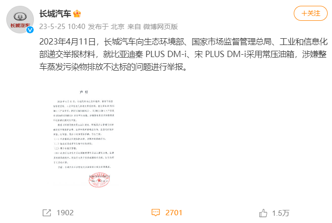 5月25日,長城汽車在官方公眾號發佈聲明,舉報比亞迪秦PLUS DM-i、宋PLUS DM-i採用常壓油箱,會造成污染物排放不達標。