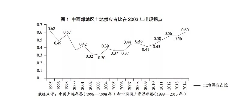 與其他市場經濟國家相比,中國的土地供應未能適應需求。在經濟全球化的時代,各地區深度參與全球經濟產業鏈的分工與合作,區位競爭力在很大程度上影響了該地區的生產率水平和產業分工。中國東南沿海的港口城市因其接近國際市場獲得了優先發展的機會,並通過規模經濟逐步形成產業集聚的優勢,同時伴隨着持續的人口流入。在通常的市場經濟中,人口的持續流入將帶來土地和住房的需求,價格機制將引導供給端適應需求端的變化,擴大該地區的土地利用規模。而**中國採取中央計劃式的土地配置方式,並試圖通過土地配置控制跨地區的人口流動和平衡地區間的產業發展總量水平。**在勞動力不斷向東部省份流入的情況下,制定出偏向中西部(特別是中小城市)的土地政策,將建設用地指標向中西部傾斜。圖1顯示了中西部土地供應占全國總量份額的時間趨勢,其中,2003年出現了明顯的拐點,中西部的土地供應占比從2003年的29.6%提升至2014年的60%。中西部地區建設用地指標的大量富餘抑制了當地的土地價格,偏低的用地成本間接地補貼了低產出效率的企業,地方政府為吸引投資和提升GDP,互相競爭性地壓低地價甚至補貼配送土地,導致土地利用效率低下;而東部省份土地供給的減少導致其土地出讓價格大幅提高,進而提升了企業的用地成本。與此同時,**建設用地指標被收緊地區的房價和勞動力工資出現了過快上漲,企業被迫以資本投入代替勞動力投入,致使中國出現了過早的產業升級;高企的房價又吸引企業將資本從製造業轉向房地產,導致製造業的生產率下降、房地產業的過度投資和結構性失衡。**一線和少數二線大城市房屋供不應求,而土地供給充足的中西部地區(特別是中小城市)房地產投資過剩。三四線城市大量的庫存滯銷對企業回籠資金償還銀行貸款形成壓力,2016年,中央經濟工作會議正式將房地產去庫存作為五大工作任務之一。