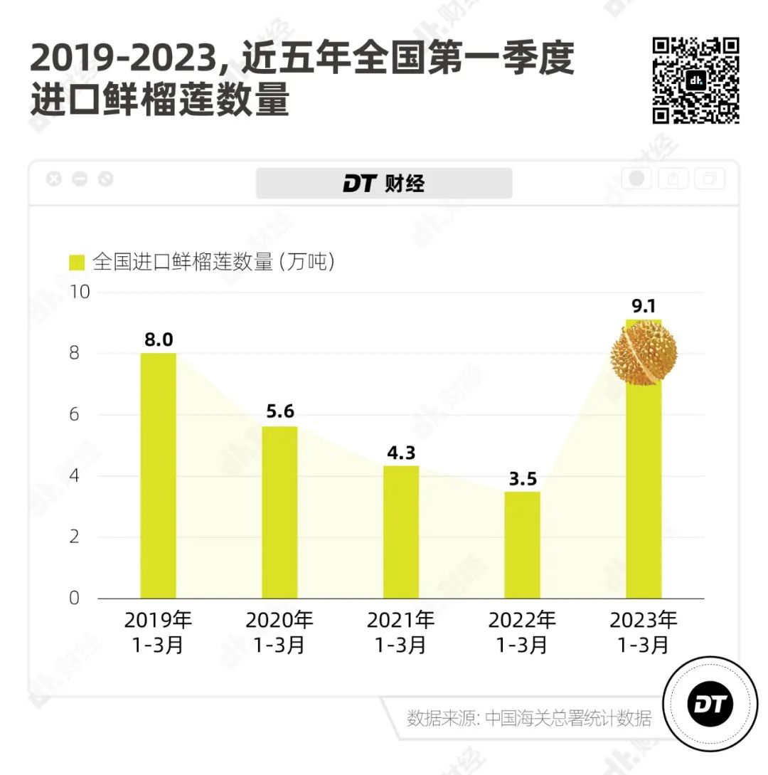 根據中國海關總署的數據,**2023年第一季度全國進口鮮榴蓮一共9.1萬噸,是近五年同期進口數量最高的一年,**甚至超過疫情爆發前的2019年。