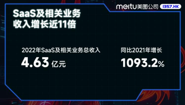 除訂閲付費業務外,美圖公司的SaaS及相關業務收入同樣增長迅猛。在B端市場,2022年美圖公司SaaS及相關業務實現收入4.63億元,同比增長1093.2%。隨着AI影像軟件在越來越多的行業實現商業化落地,為美圖公司B端收入持續保持高速增長提供了有利條件。