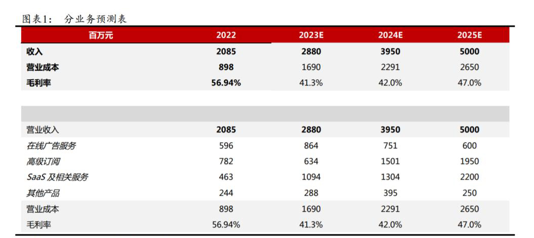 方正證券預測,2023—2025年美圖公司將分別實現總收入28.80億元、39.50億元、50.00億元,其中VIP訂閲業務預計實現收入6.34億元、15.01億元、19.50億元;SaaS及相關服務預計實現收入10.94億元、13.04億元、22.00億元。由於VIP訂閲業務收入增長預計較快,預計2023—2025年美圖公司的毛利率將逐年升高,分別為41.3%、42.0%、47.0%。