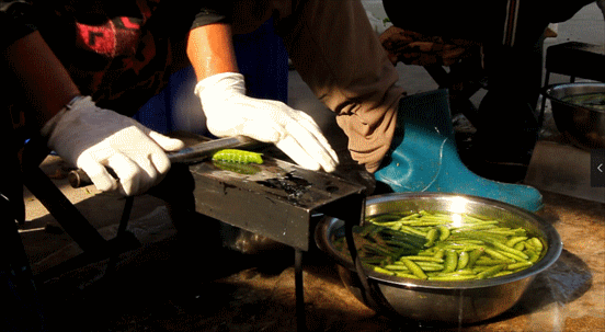 豆丹以吃豆葉維生,待長到膘肥體壯之時,從豆杆上摘下來,要先放到水中淹死,然後掐頭,用專用擀麪杖從頭擠到尾,擠出一條白白的肉,將尾部的內臟摘除,清洗乾淨就可以下鍋備用了。
