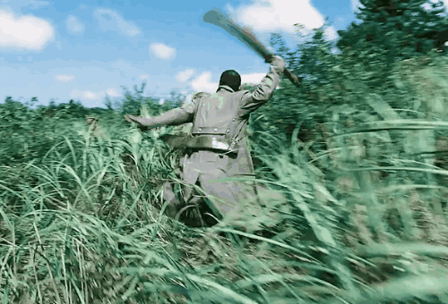 但片中的兩位主角簡直就是戰神一般的存在,一個叫黃海哲,槍法描邊但是刀法極快,砍日本鬼子就跟玩水果忍者似的,而且還只砍頭!在玉米地裏一人面對五六名持槍日軍,直接衝上去就是五殺。