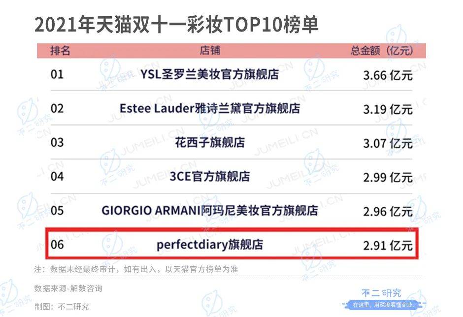 2019年雙十一,成立僅兩年多的完美日記趕超雅詩蘭黛、YSL、MAC等國際大牌,成為“雙十一”首個登頂天貓彩妝銷量榜榜首的國貨品牌;2020年,完美日記榮登天貓彩妝銷量榜第二名;2021年,完美日記位列天貓“雙十一”彩妝銷量榜的第六;2022年,完美日記首次跌出雙11預售TOP10。