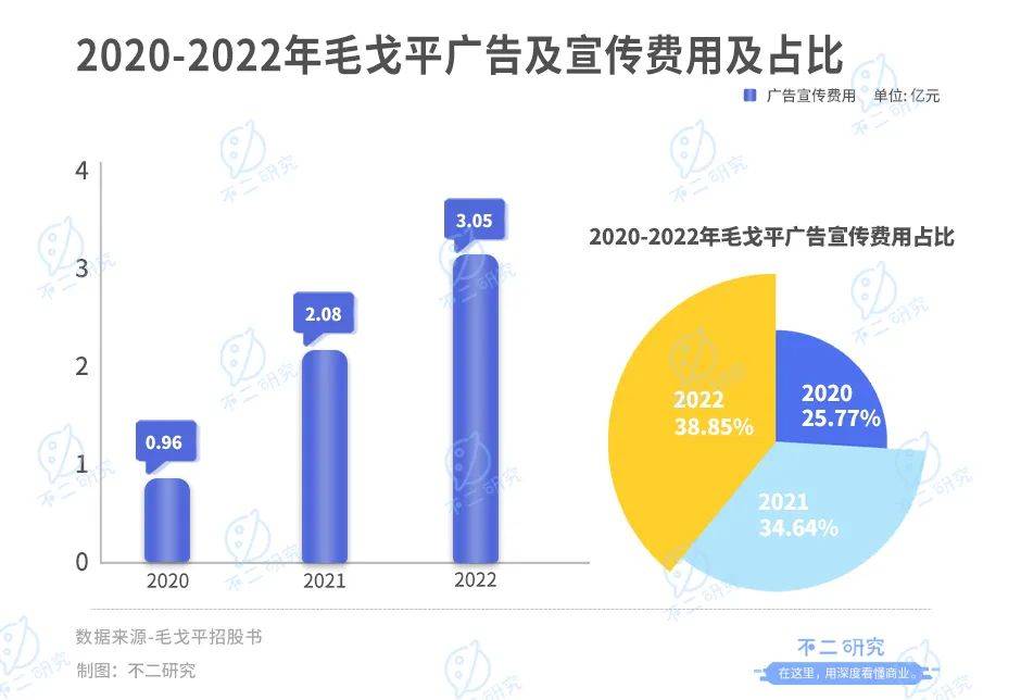 根據新版招股書,2020年-2022年,毛戈平廣告費及業務宣傳費的金額分別為9564.47萬元、2.08億元和3.05億元,三年半共花掉6億元。