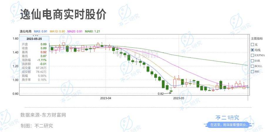 5月17日,逸仙電商一季報公佈後的首個交易日,其股價上漲1.15%,截至美東時間5月25日美股收盤,逸仙電商報收0.89美元/股(摺合人民幣193.47億元),較發行價10.5美元/股跌超90%;對比今年的高點1.82美元/股,市值已蒸發50%。
