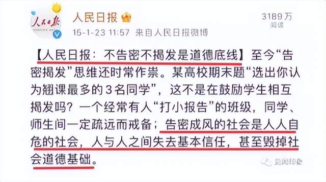 我們都還記得,畢福劍私下言論被拍攝並舉報的事件。人民日報曾經發表《不告密不揭發是道德底線》的評論。