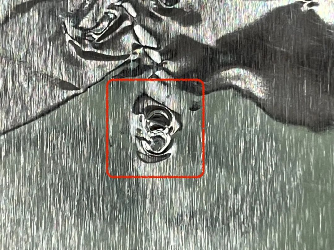 這時,可以看出由於鋼球多次彈起在鋁箔上砸出的多個“彈坑”,但是每個彈坑都是普通的圓形坑,在四周也沒有觀察到波紋。