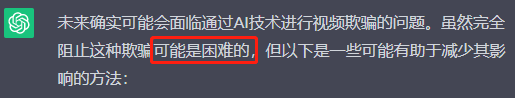 而就AI詐騙這一問題,我還專門詢問過chatGPT。它除了開頭直接點出這事非常困難外,剩下給出來的建議,幾乎全是正確的廢話。