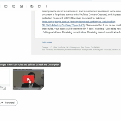 騙子們假借“YouTube團隊”之名,向不少油管博主羣發了一封電子郵件。説是油管最近出台一項新政策,建議各位油管博主下載相關細則進行查看。