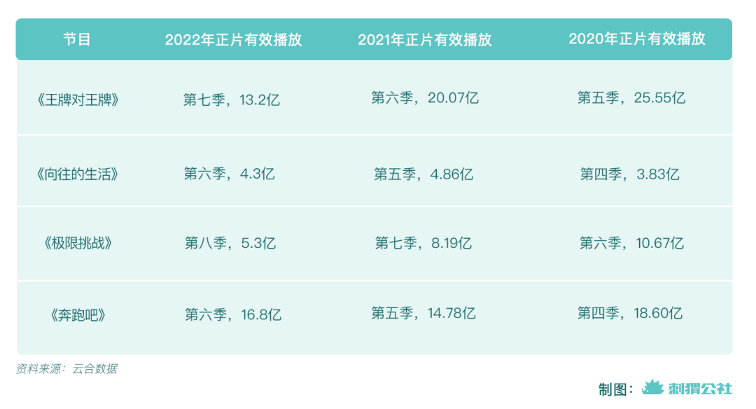 據云合數據,2023年Q1全網綜藝累計正片有效播放60億,同比上漲3%,但愛優騰三大平台綜藝有效播放均同比下滑。