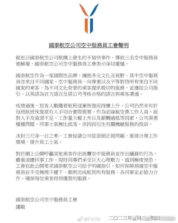 國泰航空空中服務員工會發出聲明,反而指責乘客挑釁空姐,導致“同事們承受巨大心理壓力”。一番顛倒黑白的胡言亂語,把香港黑暴時期的那份囂張重新激活。