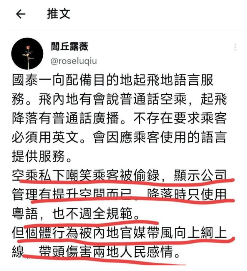 今天她批評內地對國泰事件的反應,但是忘了自己對曾經“殺光中國人”言論的包容,這不是雙標嗎。