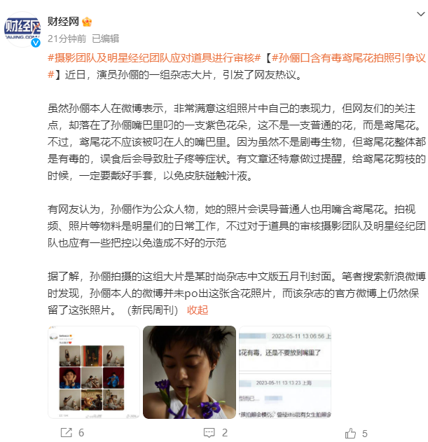 演員口含有毒鳶尾花拍照引爭議(截圖來源:新浪微博)