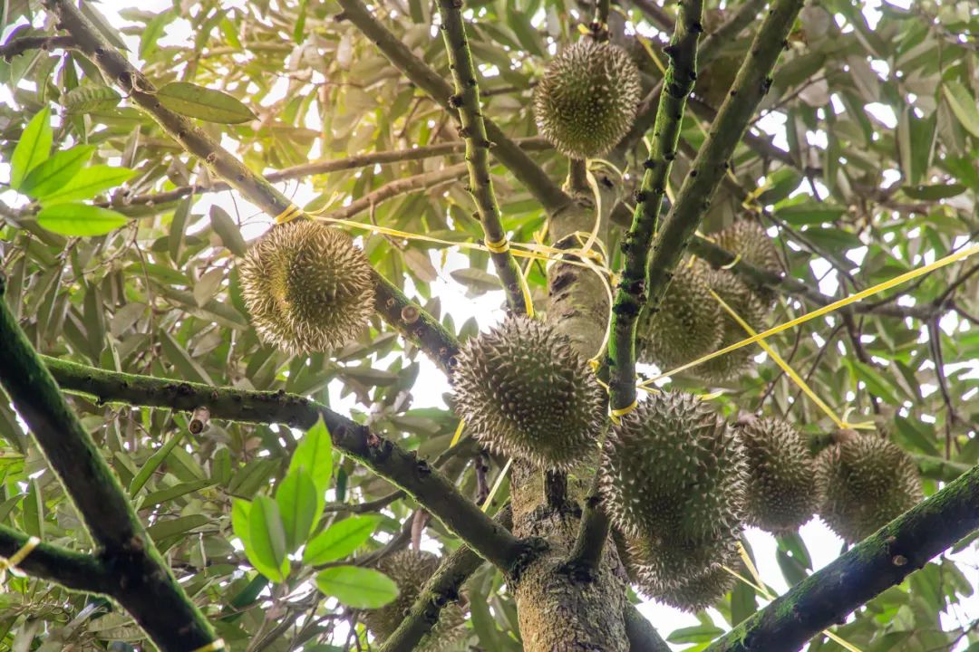 為了避免成熟的榴蓮太重,樹承受不了,果農會在榴蓮上綁拉繩。圖庫版權圖片,轉載使用可能引發版權糾紛