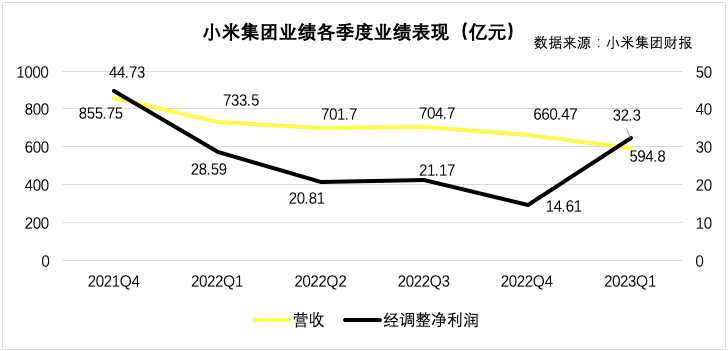 2023年一季度,囿於智能手機、IoT與生活消費產品、互聯網服務三大主營板塊,無一例外地反向波動,公司實現營收594.8億元,同比減少18.9%,環比減少9.9%,連續兩年一季度收入同比縮水,並且降幅有所放寬。