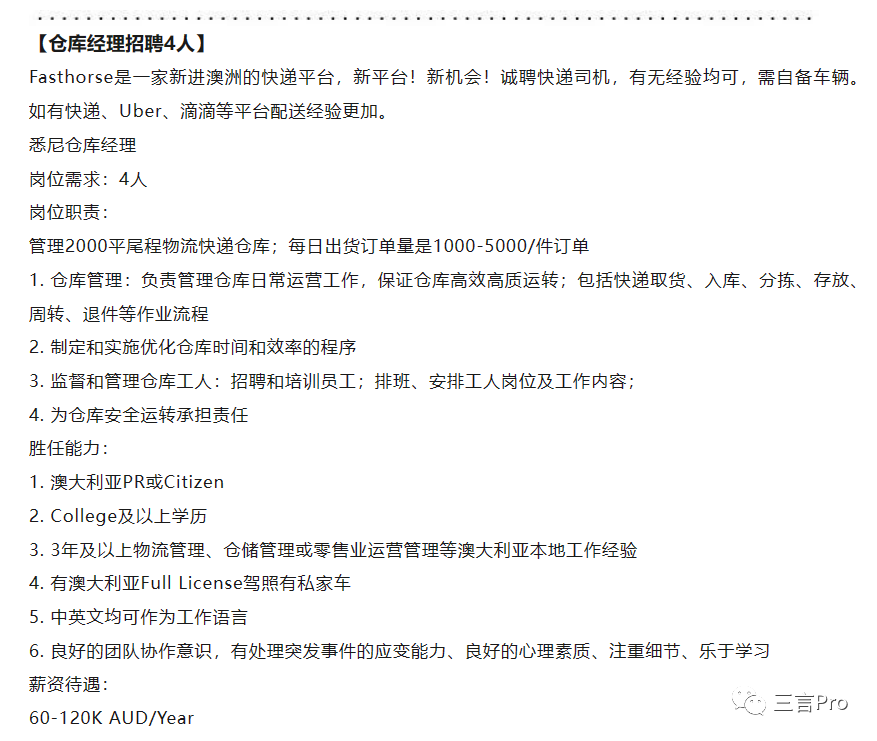 崗位要求包括:澳大利亞PR或Citizen;College及以上學歷;3年及以上物流管理、倉儲管理或零售業運營管理等澳大利亞本地工作經驗;有澳大利亞Full License駕照有私家車;中英文均可作為工作語言等。