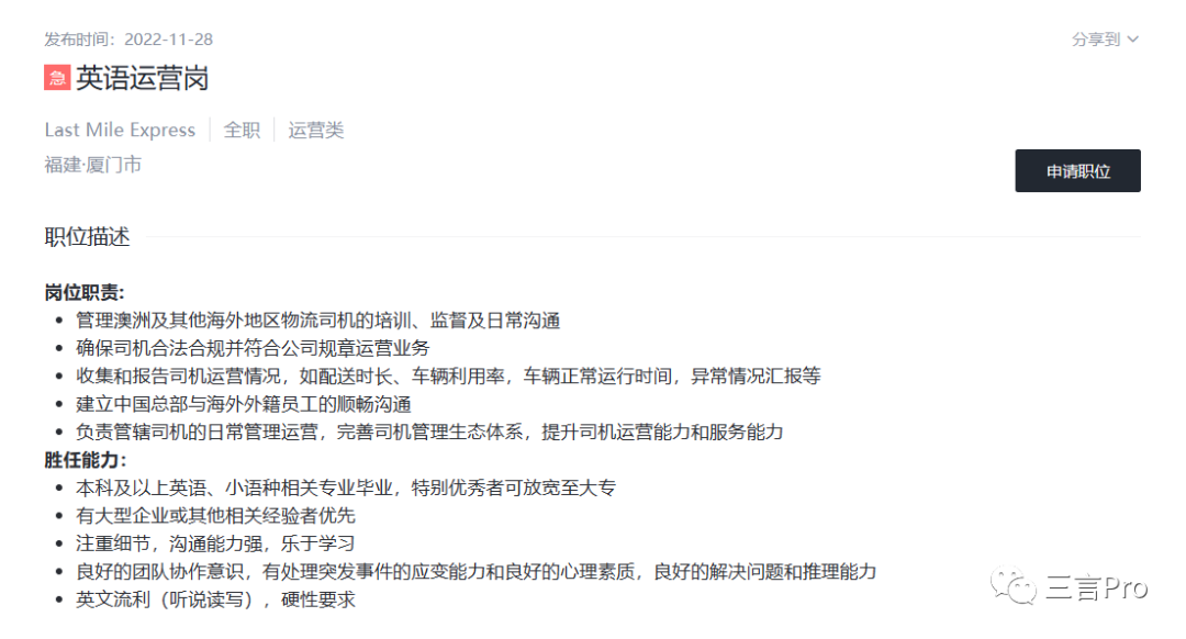 崗位職責和崗位要求,與之前發佈的英語運營崗大同小異。