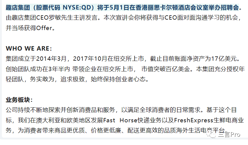 某招聘平台4月26日發佈的一則港招信息顯示,趣店集團於5月1日在香港麗思卡爾頓酒店會議室舉辦招聘會。