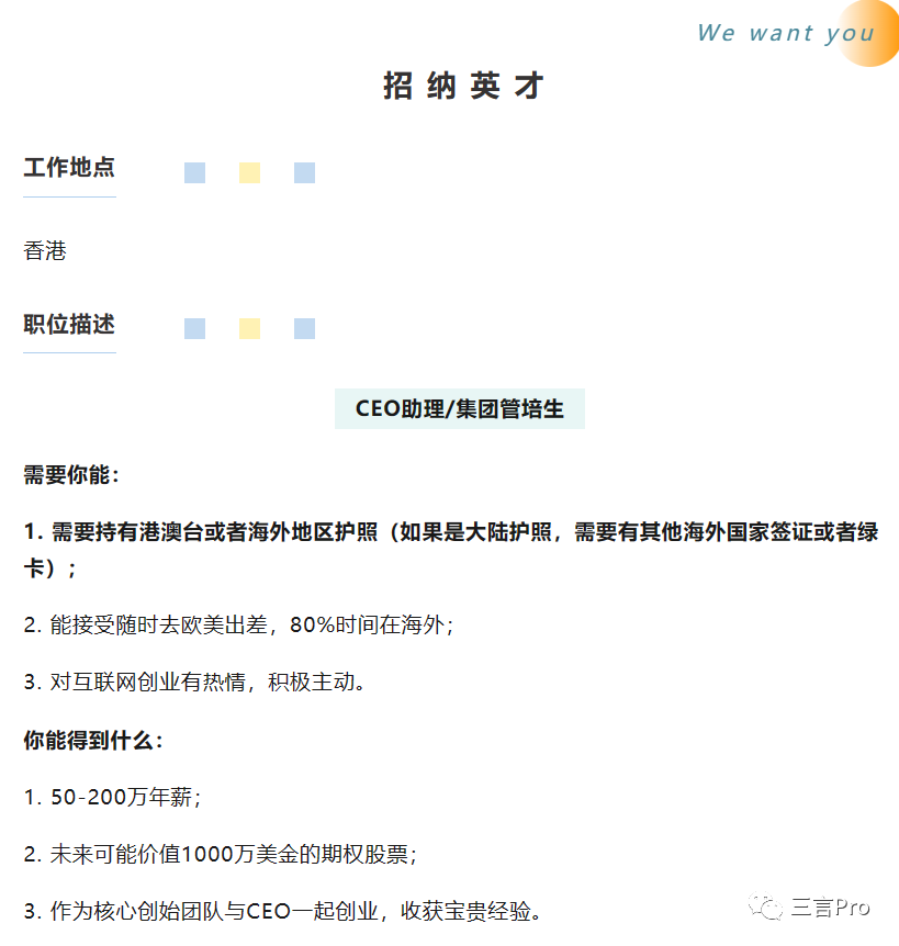 待遇為:50-200萬年薪;未來可能價值1000萬美金的期權股票;作為核心創始團隊與CEO一起創業,收穫寶貴經驗。