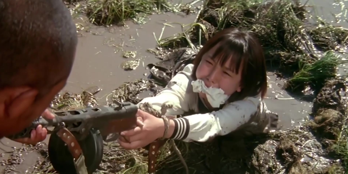 楊的奶奶被日本人用這樣殘酷的方式捅死了,他被抓去做了勞工卻眼睜睜看着日本人把他的夥伴用汽油活活燒焦,最後他們還要被集體槍決——可以説他對日本人的恨達到了無以復加的極限,但是他和蘇聯女兵娜加面對把他們引進雷區的秋葉子仍然沒有舉起軍刺;明知糧食只夠倆人吃,卻還是和娜加冒着被打死的危險救了陷入沼澤的秋葉子。——甚至他以一種農民的可愛在情感上莫名地和會説中國話的秋葉子站在一邊而固執地同娜加持相反意見。