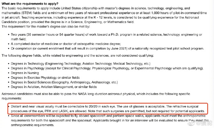 最後給一個NASA的宇航員選拔標準。他們的要求是矯正視力20/20,也就是5.0視力,而且同樣接受角膜激光手術矯正後的視力。