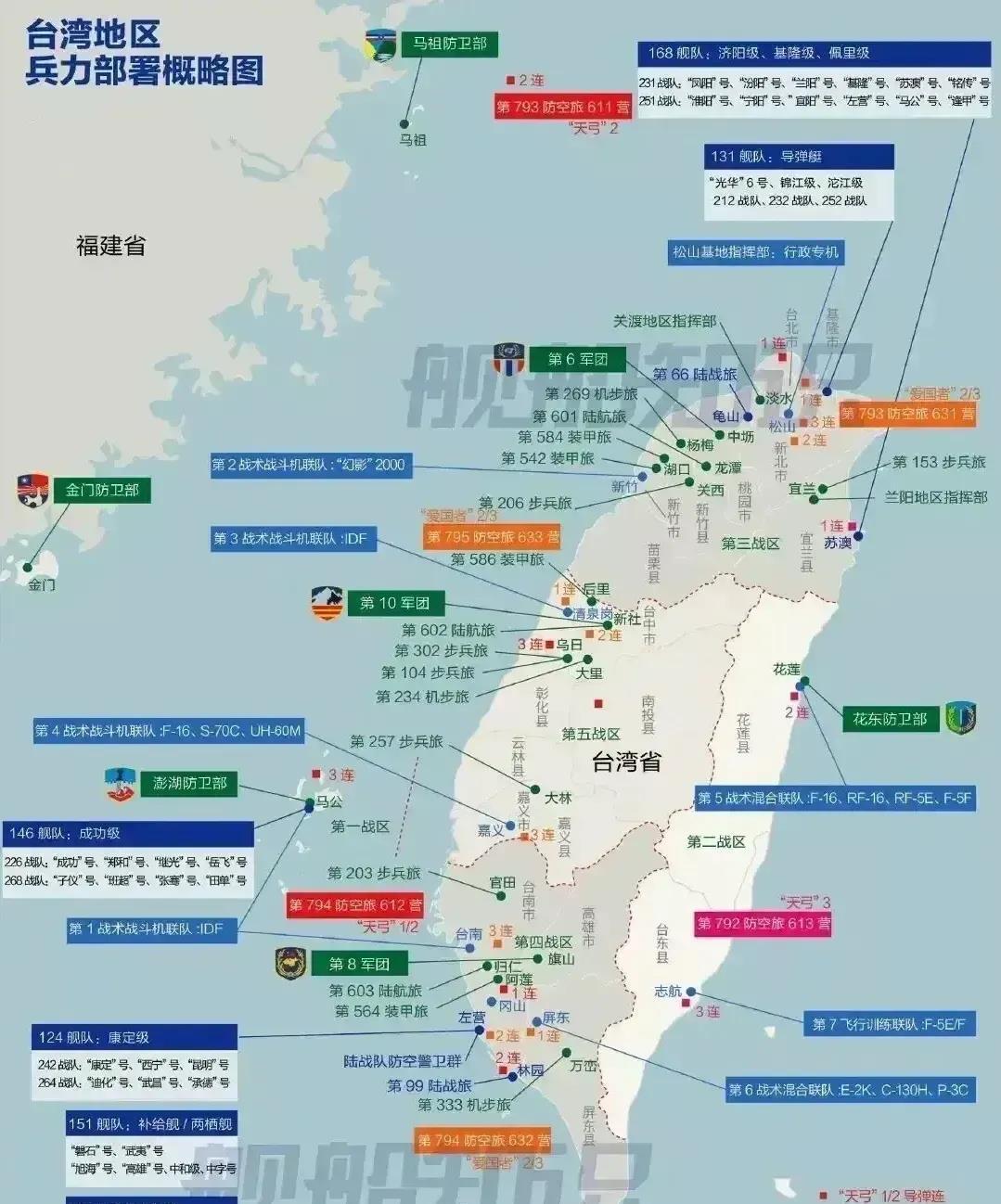 況且烏克蘭能到現在這樣,最表層的原因是他們頂住了俄羅斯的進攻。但台灣想頂住中國的進攻,這難度可不低。況且台灣主要城市都在沿海,你們根本就沒有縱深,全部進山打游擊聽起來很酷,但其實真的沒有操作空間。台灣自家武備力量我覺得基本可以一鍵歸零,中國不可能在沒有充分準備的情況下動手。台灣海峽幾乎是天然的登陸場,台灣那些工事跟紙糊的也沒啥太大的差距,論防空系統,之前我在微博上看到過一張圖。