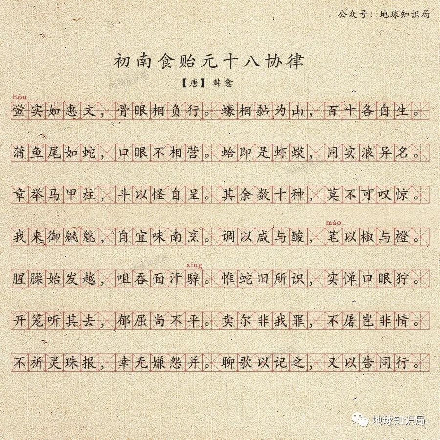 “蒲魚尾如蛇,口眼不相營。”蒲魚也是一種東南沿海盛產的海魚,看上去像是軟妹版的鱟,也是有一根神奇的蛇尾,對於韓愈來説,這就是形容這種魚最好的抓手了。