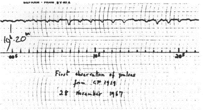 在1967年8月6日,約瑟琳·貝爾(Jocelyn Bell)正在觀察一支紅筆在移動的記錄紙上畫出的波浪線——這是她用射電望遠鏡觀察遙遠的星系得到的博士課題數據。她注意到一個波浪線看起來很奇怪。貝爾現在是牛津大學天體物理學客座教授,她在辦公室裏告訴我,那是一個“細小的雜峯”。這個“雜峯”是一系列間隔1.3秒的尖鋭脈衝。貝爾接下來幾個晚上都在持續觀察它。