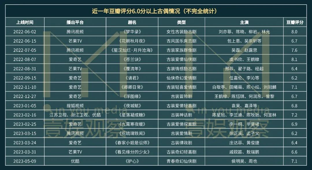 然而,即便重生後的古偶劇勢能不俗,但也並非每部“後來者”都能完成以上所提及的“重生”,在今年上半年播出的古偶劇裏,仍有不少古偶劇因為劇情爛尾、演員演技、服化道不過關、特效拉胯等過往古偶劇的通病因素,被網友繼續打出低分。在下一輪重生古偶的混戰裏,這些過往“病情”或許因被診斷清晰而剷除部分,但是,數量增長背後無法避免更多新的同質化因素、審美疲勞要點會顯現出來。