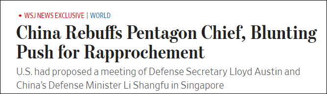 五角大樓在給《華爾街日報》一份聲明中表示:「在晚上,中國通知美國,他們拒絕了我們5月初提出的關於奧斯汀部長與中國國防部長李尚福本週在新加坡會面的請求。」聲明還稱,「國防部堅信,為確保競爭不會演變成衝突,保持華盛頓和北京之間開放的軍事溝通渠道很重要」。