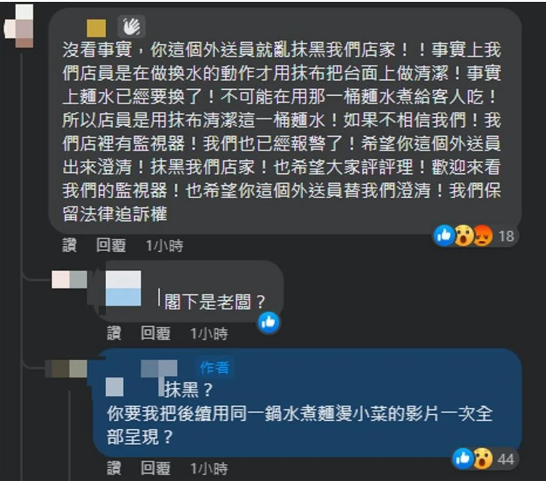 對此,店家回應,這根本是外賣員亂抹黑,“事實上我們店員是在做換水的動作,才用抹布把枱面上做清潔”,之後面水已經更換,“如果不相信我們!我們店裏有監視器!我們也已經報警了!”
