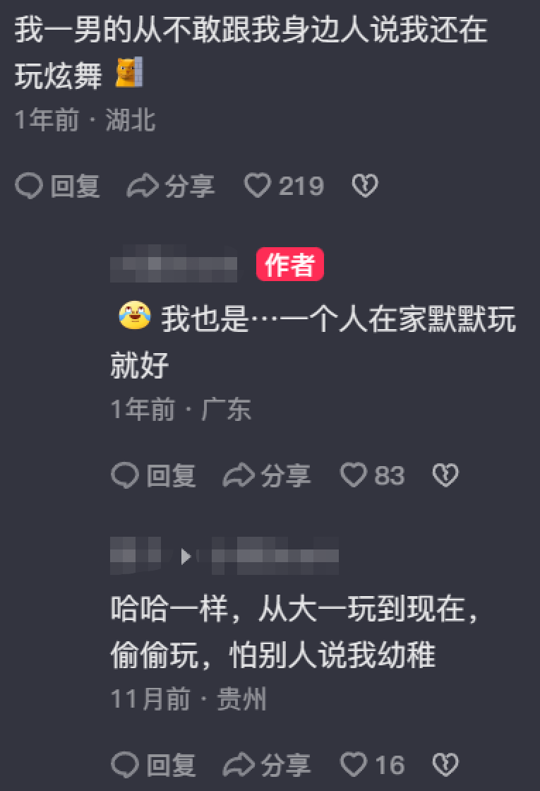 但偶爾,就像那位UP主視頻的評論區裏一樣,如今網絡上也能看見炫舞玩家們聚集在一起。他們中有不少人提到自己其實依然熱衷於這個遊戲,只是從來不敢對外承認玩炫舞——當年是怕被人視作“非主流”,現在則又是擔心被説“幼稚”或“老古董”,而他們只是想簡簡單單玩個遊戲。