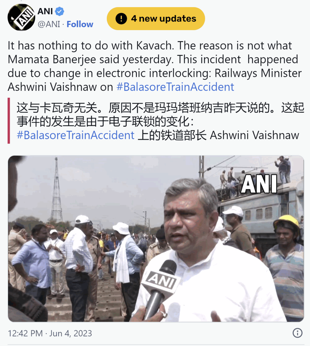 印度鐵道部長:電子閉鎖裝置故障導致事故: https://twitter.com/ANI/status/1665217415381417985