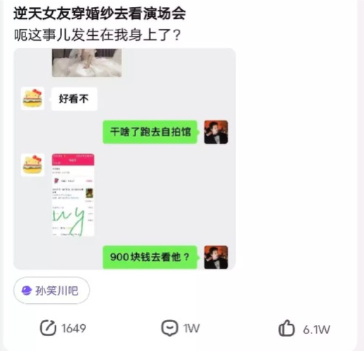 後是著名糞坑“孫笑川吧”突然蹦出來一則帖子:“逆天女友穿婚紗去看演唱會。”