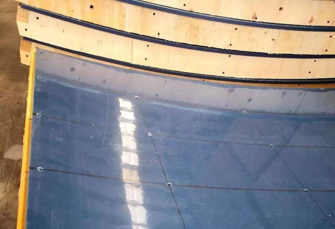 為保證弧形底板環向施工縫處鋼邊橡膠止水帶安裝質量及弧形底板分佈筋定位及間距,項目部定製了專用的覆塑裝配式模板,大大提高施工作業標準及堵頭模安裝效率。