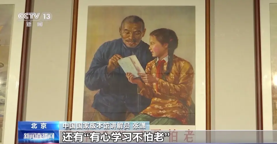 中國國家版本館講解員 張瀟:展台上是“年連宣”的“連”,連環畫,主要展示了二十世紀五十年代到七十年代的經典連環畫的版本還有它們的畫稿。牆上是“年連宣”的宣,宣傳畫,這一組就是有關讀書學習主題的宣傳畫,像非常經典的“努力學習”,還有“有心學習不怕老”,可以體現出當時的老百姓也是非常注重讀書和學習的。