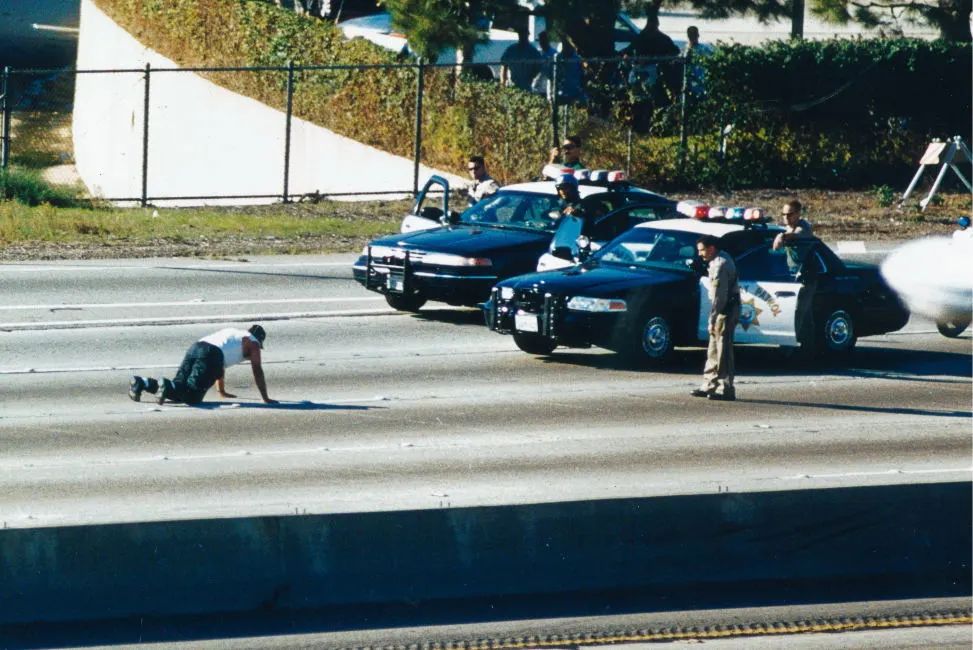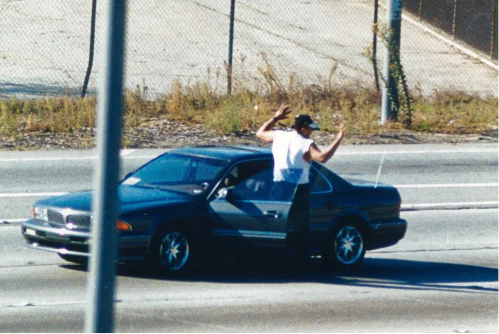 剛走到不遠處馬路邊綠化帶,突然聽到不遠處傳來一陣急促的槍聲。我定神一看,一輛飛馳而來的黑色轎車駛到不遠處,連續幾個急轉身停了下來,一個白人從車裏伸出一把手槍向後面駛來的警車頻頻射擊。我嚇得慌忙躲到馬路邊一側的電線杆後定了定神,喘着粗氣舉起相機對準持槍男子先掃了三四個鏡頭,隨後藏在電線杆後不敢動彈。