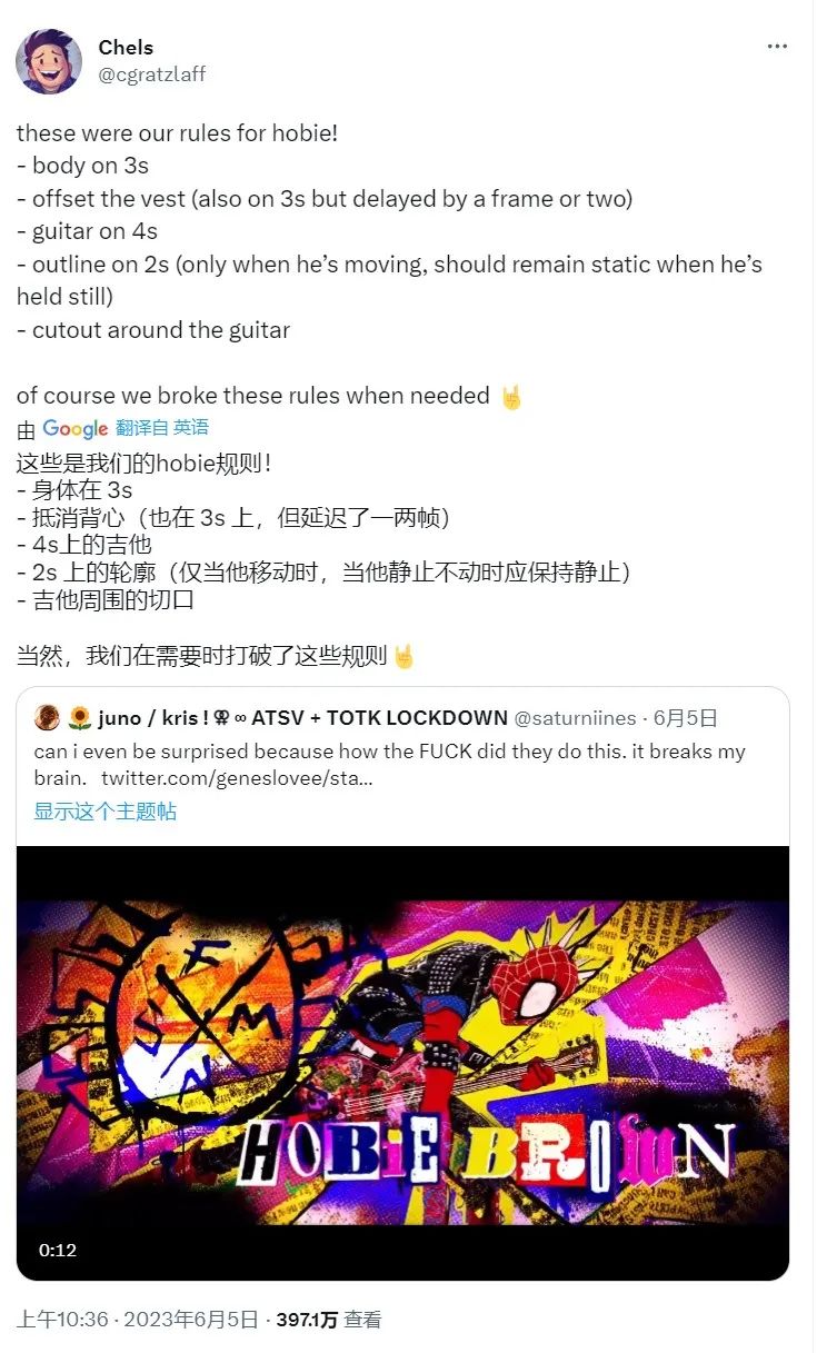 當霍比動起來的時候,身體、背心和吉他之間因為不連貫而產生了一定的錯位感,這是《平行宇宙》裏的蜘蛛俠們從未曾出現過的動作設定。《縱橫宇宙》是如何製作出霍比動作的?電影的動畫監製切爾西·戈登-拉特茨拉夫在推特上回應了影迷的提問。