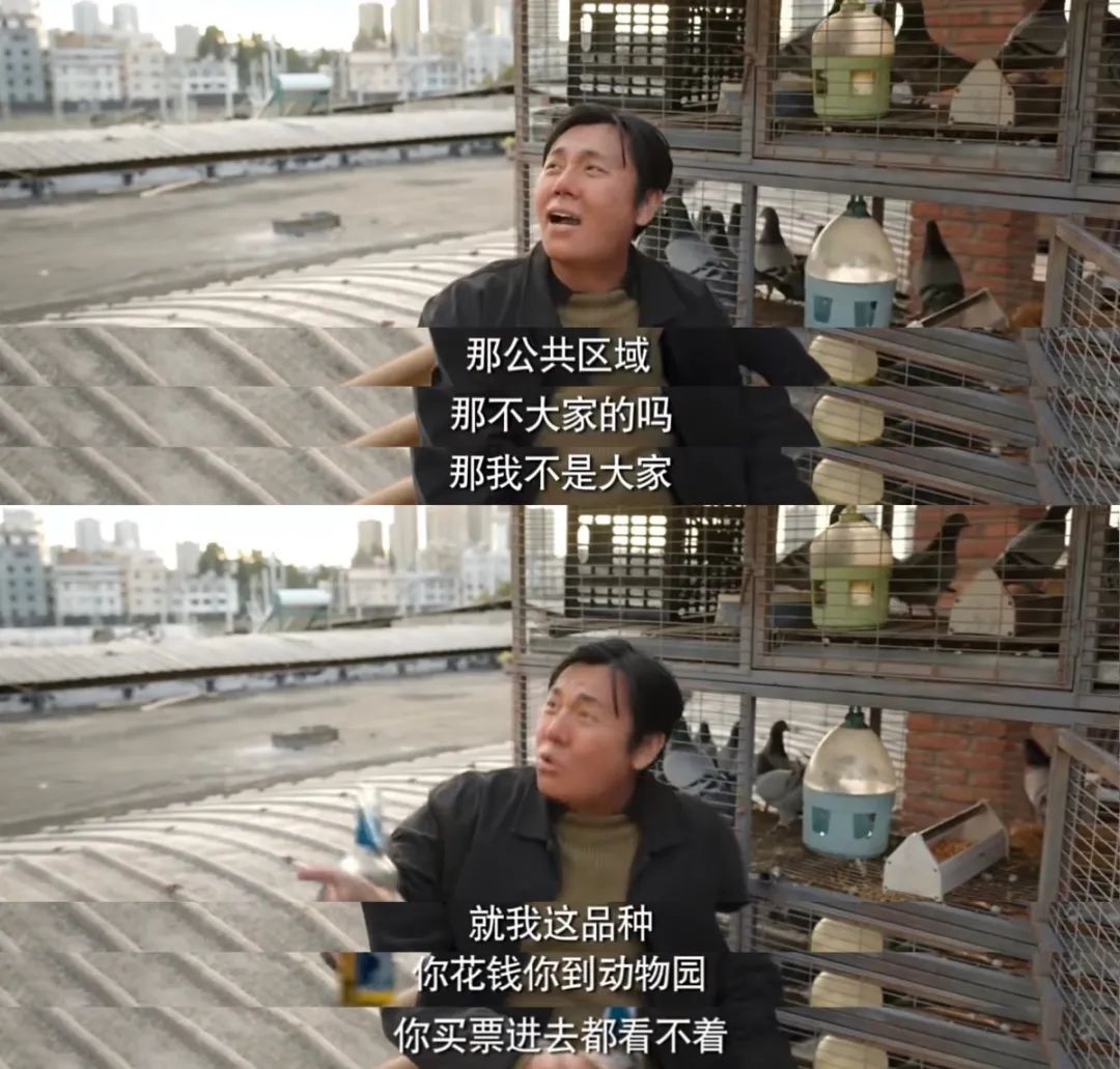 他在小區公共區域養鴿子,鄰居罵他沒有公德心,他一通輸出讓人無言以對,還藉着勸慰鴿子,説出了那句代表他人生哲學的金句:「該吃吃,該喝喝,啥事別往心裏擱。」