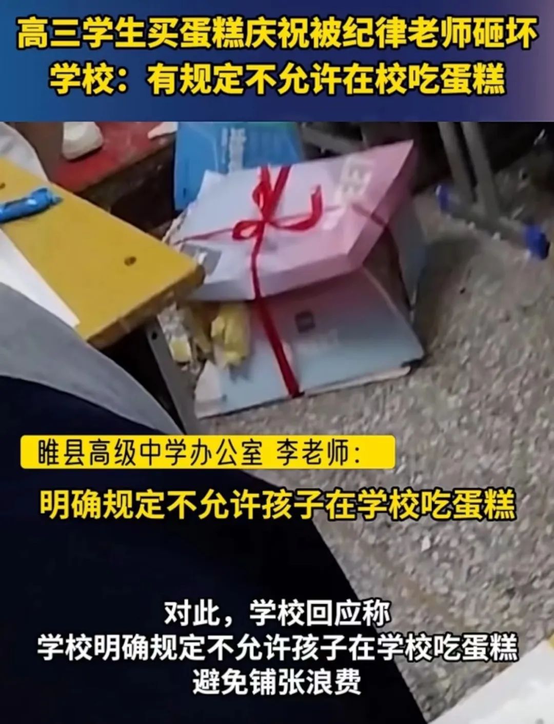 學生也許本來是愛自己母校的,尊敬老師的,本來以後可以驕傲地回憶高中三年的拼搏史的,現在可好,以後介紹母校就是“老師砸爛學生蛋糕的那個學校”……這個名出得歪門邪道的。