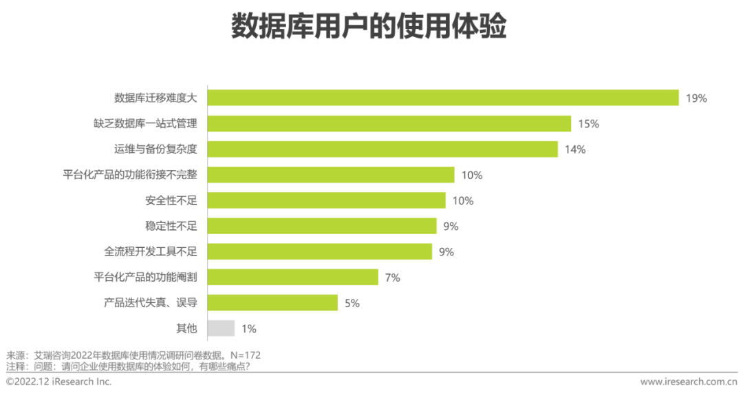 根據艾瑞諮詢2022年數據庫使用情況調查結果顯示,在數據遷移難度、數據庫一站式管理、運維與備份複雜度是數據庫用户遇到最多的幾個難題。