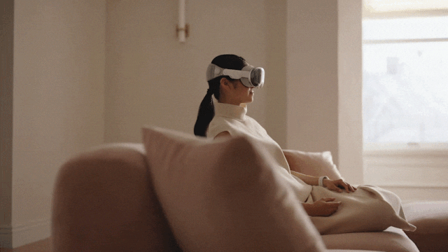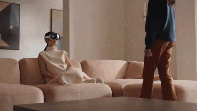首先,任何app都不能阻擋跟身邊人的交流。Vision Pro頭顯上有個用來調沉浸感的旋鈕,只要用户不調到完全沉浸,任何靠近的人都會脱穎而出。就比如你在看電影,這時候你女朋友走了進來,她所在的那塊區域就會變成半透明。